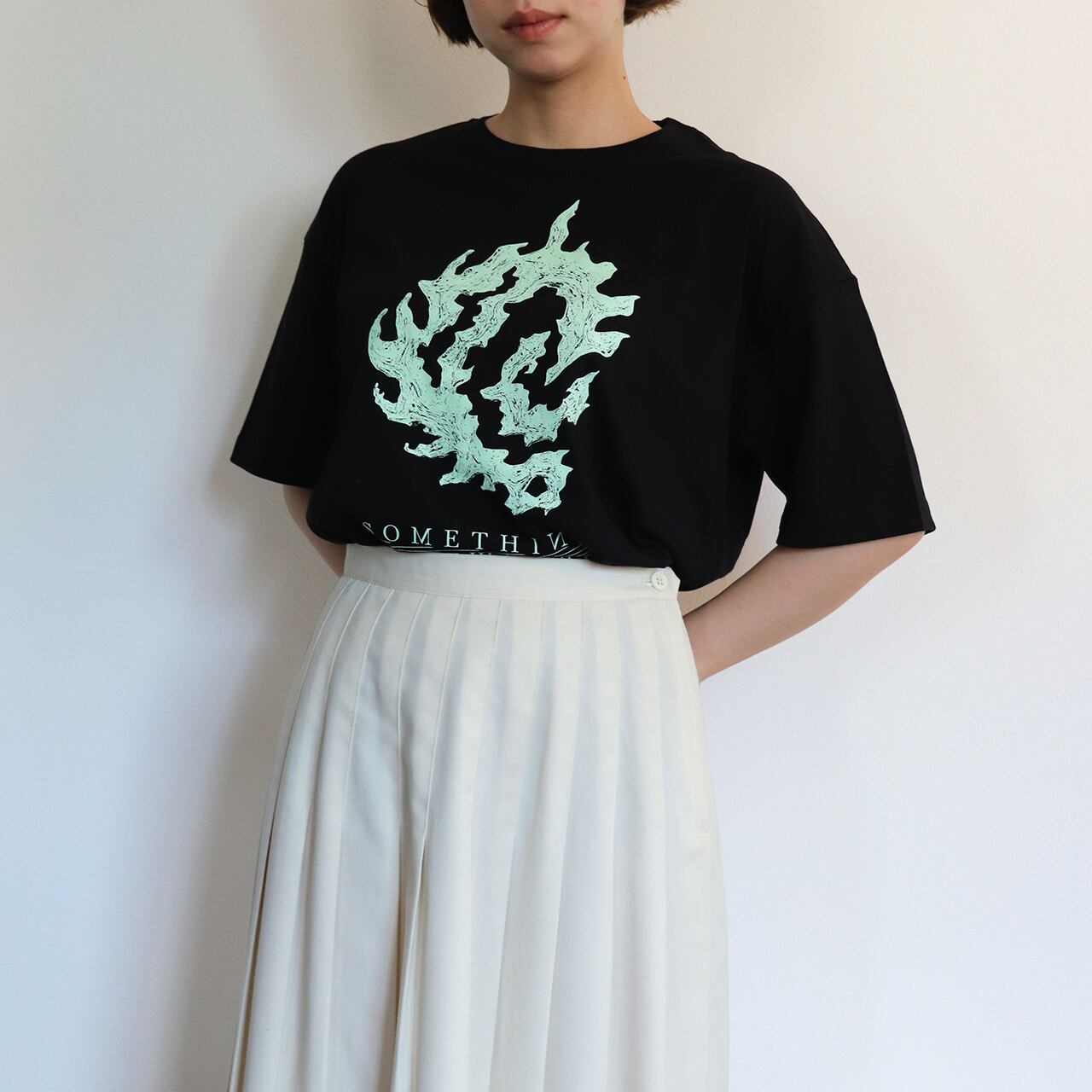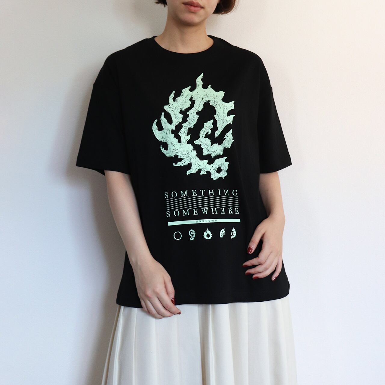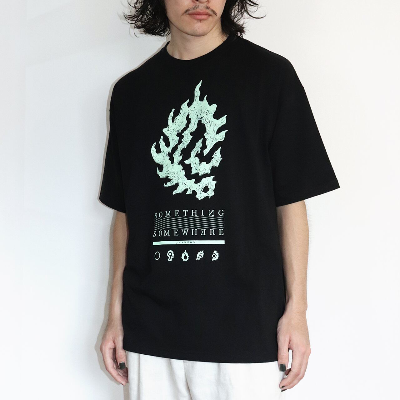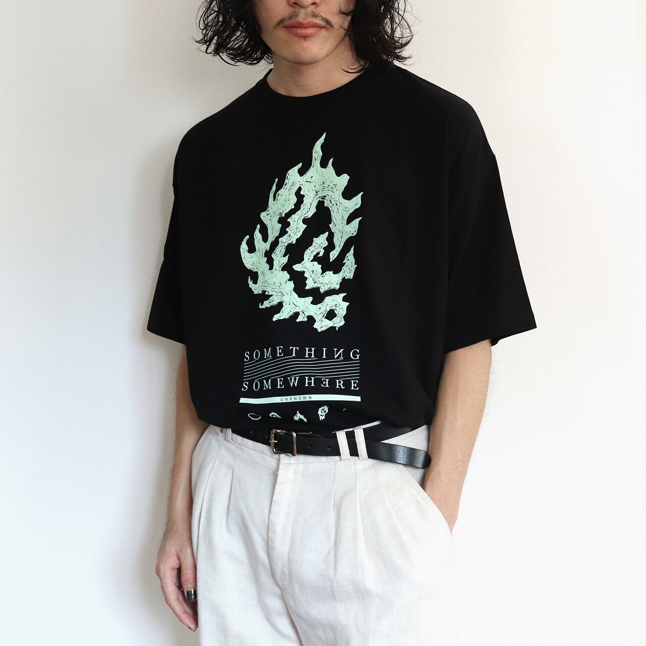 「SOMETHING SOMEWHERE」シリーズのビッグシルエットTシャツです。シリーズの中でもひときわ存在感のあるグラフィックを大胆にプリントしたモードな一枚です。